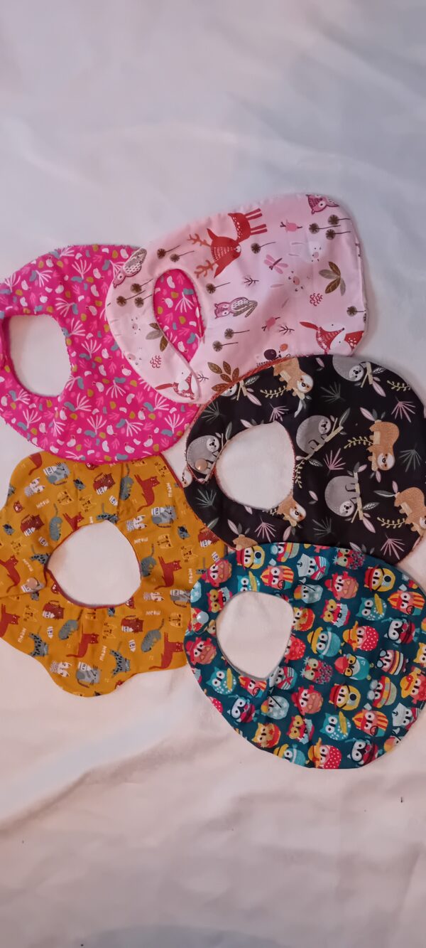 Idée de cadeau pour une naissance, petit bavoir pour bébé ou enfant, indispensable pour les repas. Modèle rond , bandana et fleur, se ferme à l’aide de pression . 3 taille : naissance, bébé et enfant .