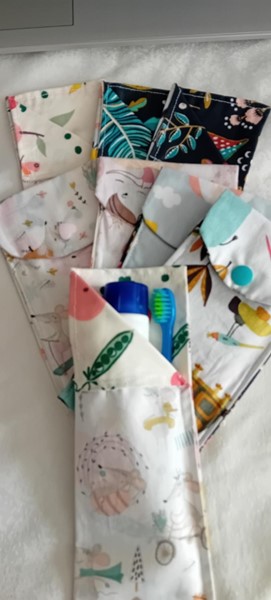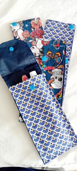 Petite pochette ( adulte ou enfant) a emporter partout dans son sac, en vacances ou au travail . Tissu extérieur en coton et intérieur coton enduit, fermeture avec pression, nettoyage rapide petit coup d’éponge ou machine 30°
